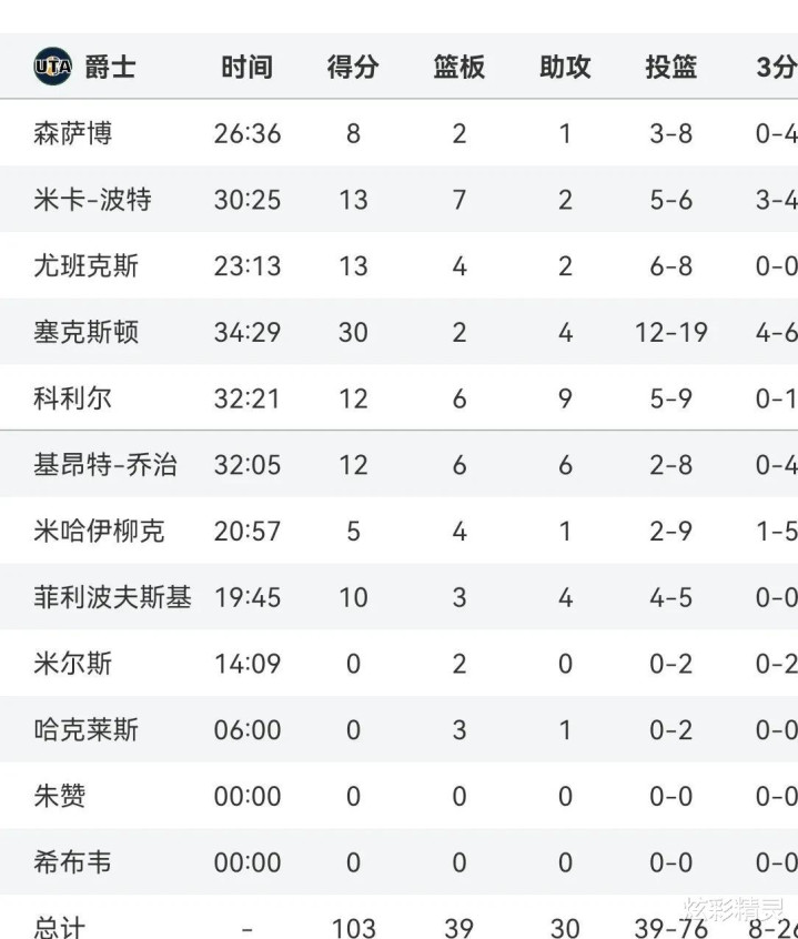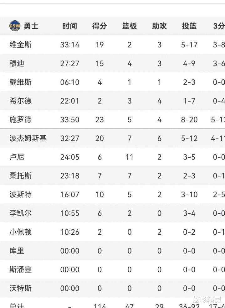 本场比赛,多个球员都奉献了精彩的演出。爵士队的塞克斯顿砍下全场最高的30分,米卡波特也贡献了13分7篮板,展现了他们的得分能力。然而,勇士队的球员表现同样出色,尤其值得称赞的是施罗德。他全场得到23分5篮板4助攻,在受伤的情况下依旧拼尽全力,成为了勇士队获胜的关键人物之一。此外,维金斯得到19分,波杰姆斯基贡献20分7篮板6助攻,两人的稳定发挥也为勇士队最终的胜利提供了保障。